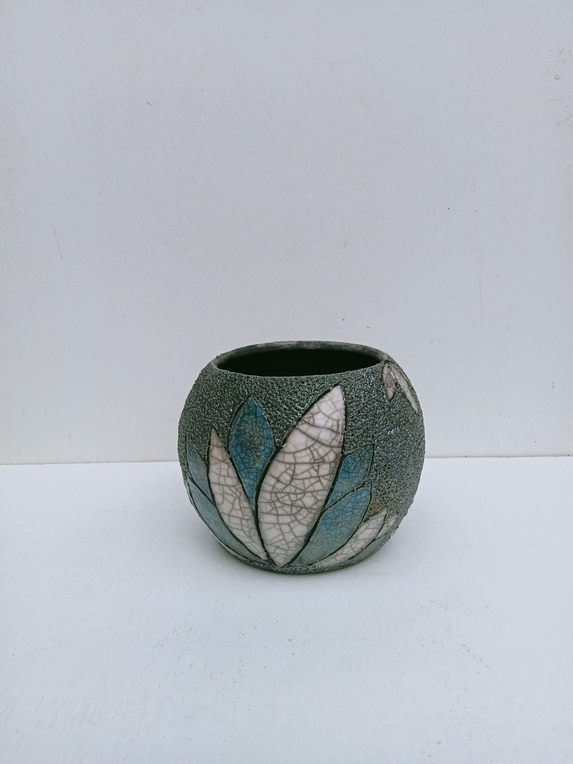 Ce cache pot en céramique , façonné selon la méthode traditionnelle du raku, est une pièce artisanale ce cache pot présente des craquelures subtiles et des nuances fumées qui font de chaque pièce une œuvre unique.